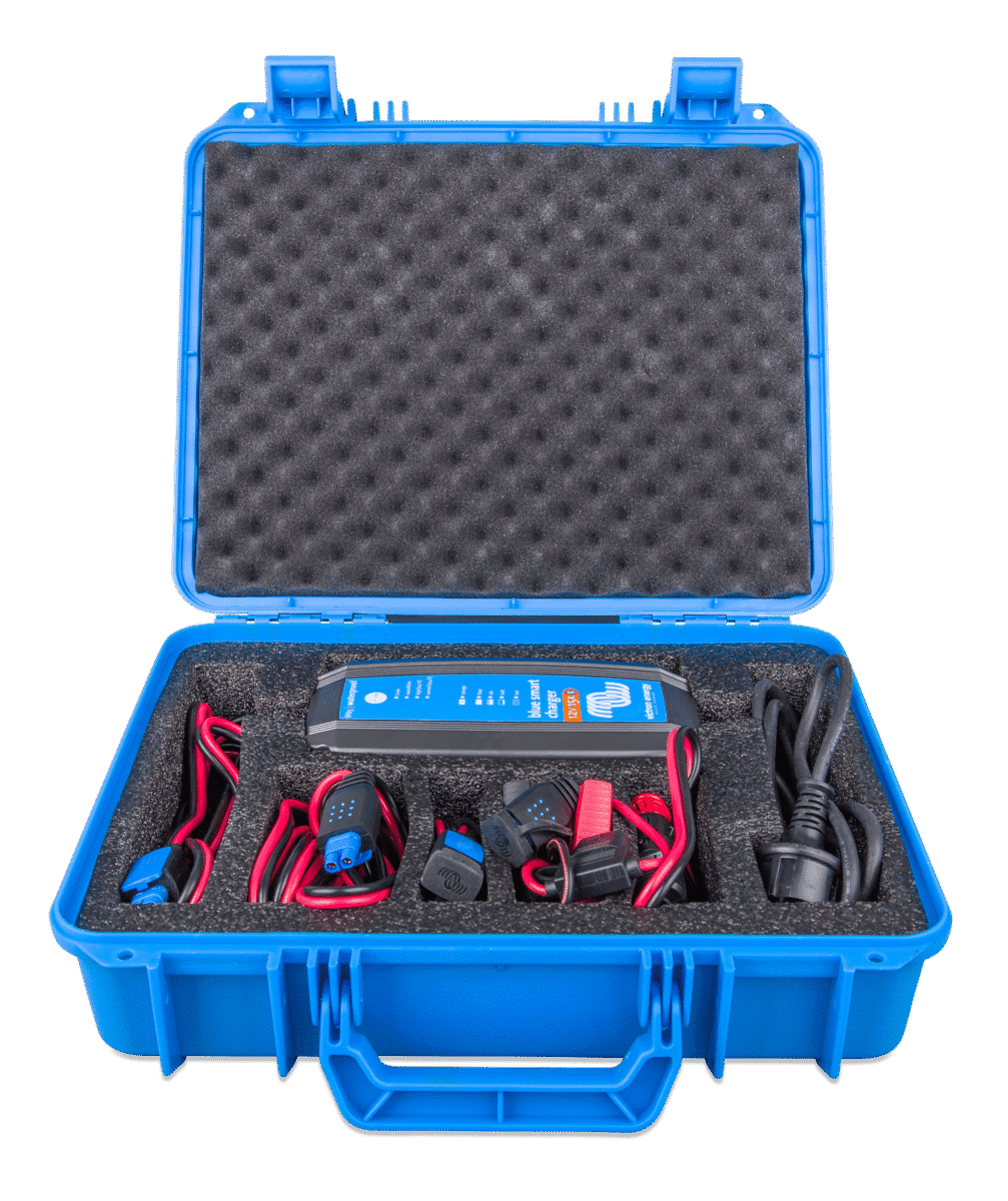 Slim en professioneel; deze nieuwe draagkoffer biedt een beschermende opslagruimte voor en gemakkelijk vervoer van uw Blue Smart IP65-Oplader en de bijbehorende accessoires.