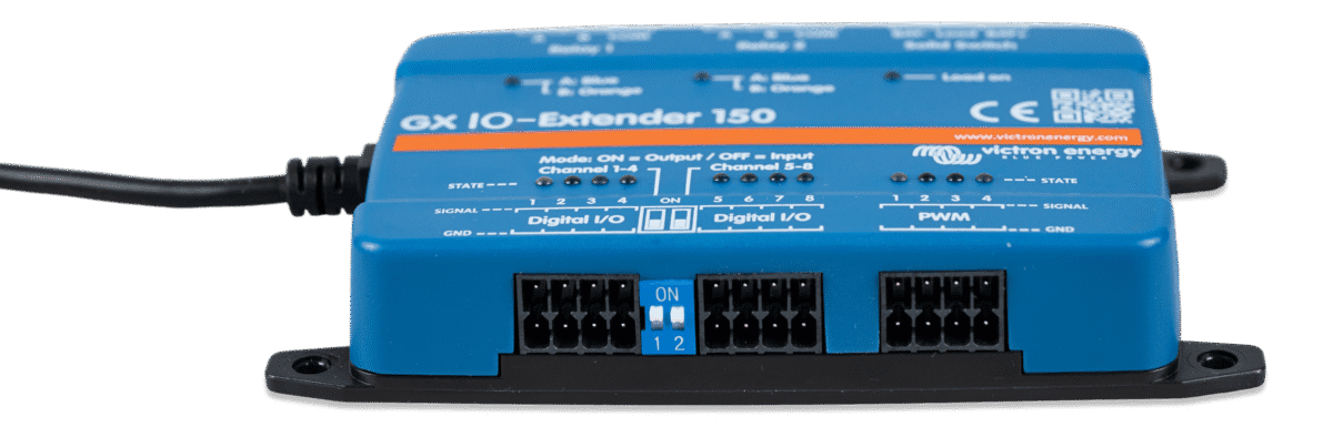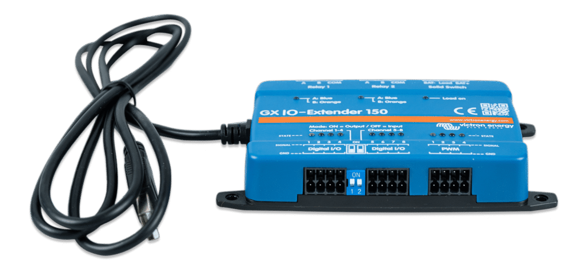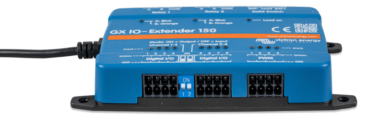 De GX IO-Extender 150 breidt de invoer- en uitvoermogelijkheden (I/O) van een GX-apparaat uit, naadloze integratie met extra sensoren, bedieningselementen en externe apparaten mogelijk makend. Het wordt aangesloten via USB, dat ook als voedingsbron dient, en biedt een eenvoudige en efficiënte uitbreidingsoplossing. Het apparaat kan zowel bestuurd worden met Node-RED op het GX-apparaat als het deelvenster Switch in de gebruikersinterface.