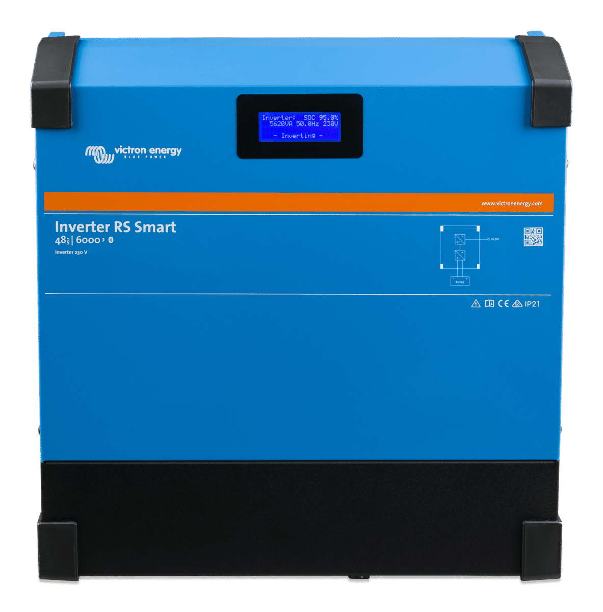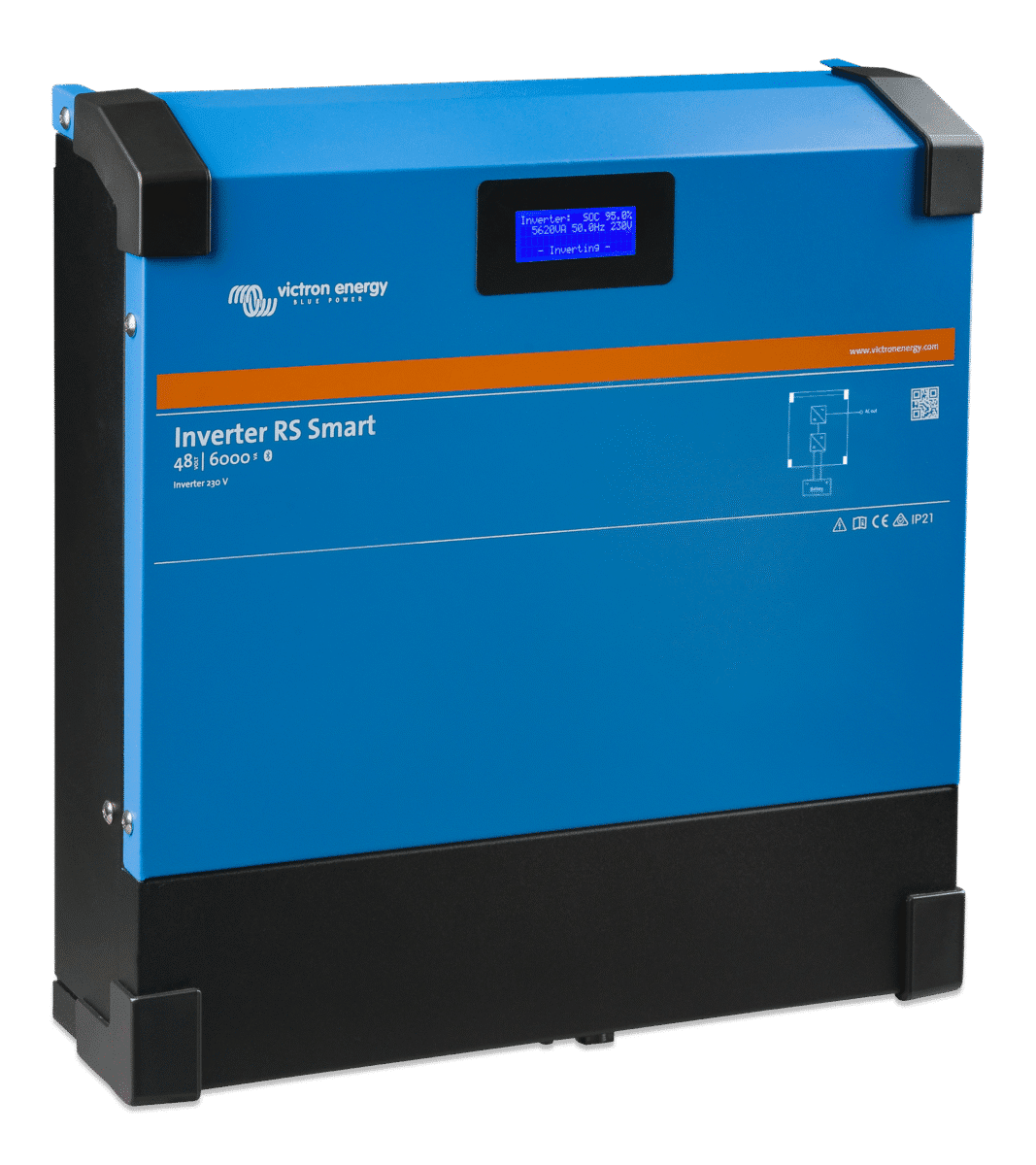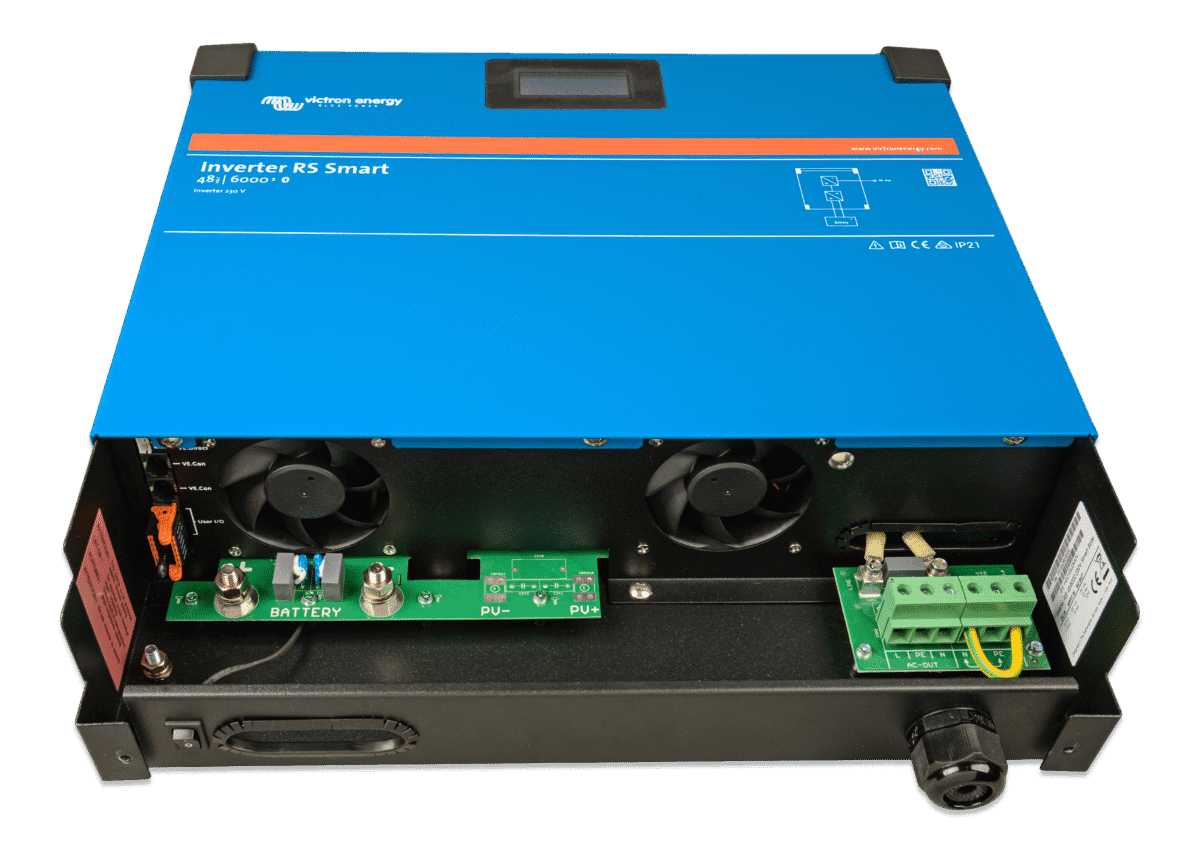 De Inverter RS Smart is een krachtige 48 VDC, 6 kVA 230 VAC omvormer. Hij heeft een modern ontwerp en hoge frequentietechnologie, weegt slechts 11 kg en heeft uitstekende efficiëntie, laag standby-vermogen en een zeer stille werking.