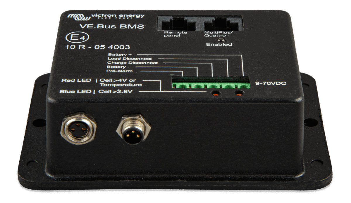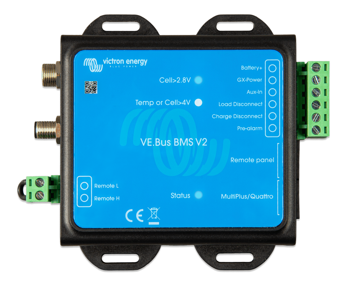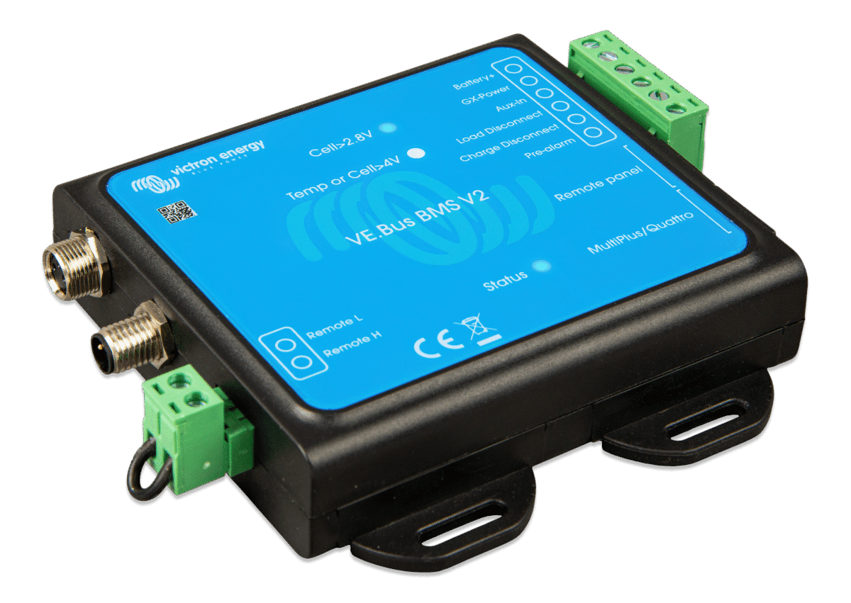 De VE.Bus BMS en VE.Bus BMS V2 zijn accubeheersystemen (BMS), ontworpen als interface met, en bescherming van, één of meerdere Lithium Battery Smart 12,8 V & 25,6 V-accu’s (LiFePO4 of LFP) in systemen met Victron omvormers of omvormer/laders uitgerust met VE.Bus-communicatie. Het BMS bewaakt en beschermd de accu’s tegen te hoge spanning en te lage spanning van elke afzonderlijke cel, en tegen te hoge of te lage temperatuur.