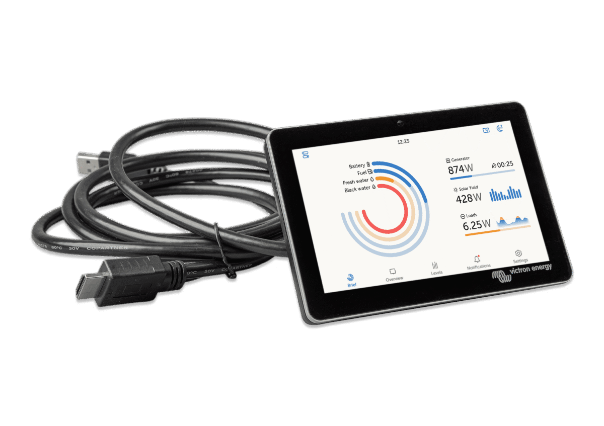 De GX Touch 50 en GX Touch 70 zijn beeldschermaccessoires voor onze Cerbo GX. Het vijf en zeven inch touchscreen geeft meteen een overzicht van uw systeem en stelt u in staat in een oogwenk instellingen aan te passen. Verbind de Cerbo GX simpelweg met een kabel, hun zeer dunne waterdichte design, top monteerbare setup en eenvoudige installatie zorgen voor veel flexibiliteit bij het creëren van een helder en schoon dashboard.
