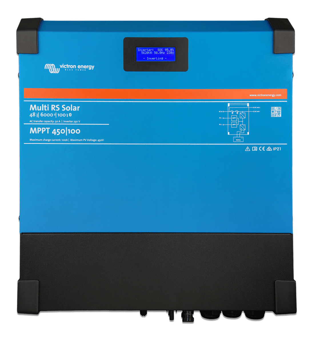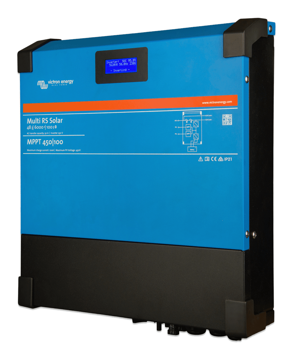 De Multi RS Solar 48/6000 is een 48 V 6 kVA omvormer/acculader met twee onafhankelijke 3 kWp PV 450 V MPPT traceeringangen voor 6 kWp PV totaal.