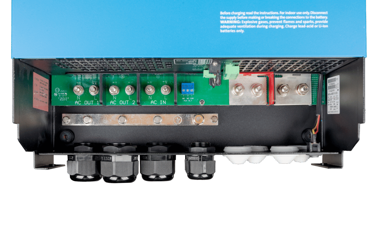 De MultiPlus-II is een multifunctionele omvormer/acculader met twee AC uitgangen. Geschikt voor professionele maritieme, watersport, auto en land gebaseerde zelfvoorzienende systemen, het biedt ook de isolatie en redundantie die vereist is voor ESS installaties. Met PowerControl voorkomt de MultiPlus-II overbelasting van het elektriciteitsnet of het aggregaat, terwijl PowerAssist het AC vermogen tijdens piekverbruik verhoogt. Bij een stroomstoring schakelt de omvormer binnen milliseconden over, waardoor computers en gevoelige elektronica zonder onderbreking blijven werken. De acculader combineert snelheid met efficiëntie via een smart adaptief algoritme dat de accu levensduur verlengt. De MultiPlus-II is klaar voor uitbreiding en ondersteunt parallelle en 3-fasen configuraties als een systeem moet worden uitgebreid.